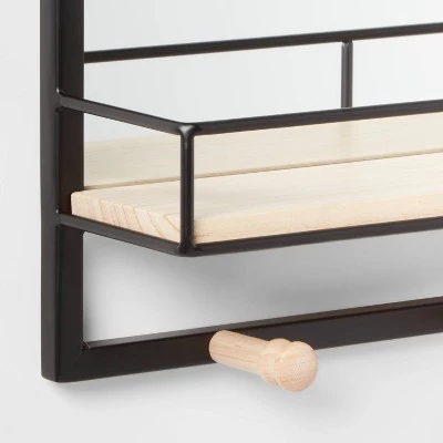 Make a functional addition to your home with the Wood Entryway Organizer with Mirror from Brightroomâ„¢. This large entryway organizer features a rectangular mirror with a built-in shelf and multiple hooks below it to provide enough space for your cosmetics, plants, towels and other items. The black frame complements the wooden shelf for an appealing look, and you can simply hang it along the entryway wall to add a beautiful look to the space.