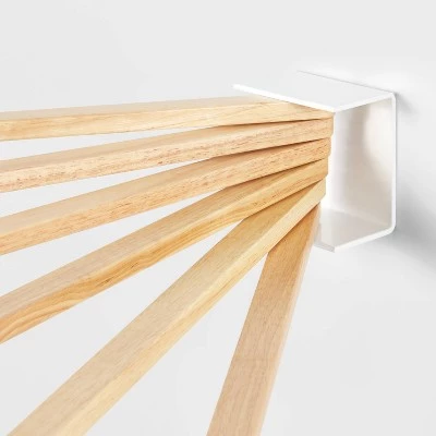 Create a spot for air-drying laundry in even the smallest of spaces with the help of this Small Space Wall-Mounted Drying Rack from Brightroom™. Featuring a clever, compact design made of rubberwood arms on a white wall mount, this small drying rack lets you hang six garments comfortably, even in a laundry room or apartment with limited space available. The rust-resistant rubberwood arms are staggered to help laundry air dry, and can be folded up for flat storage against the wall when they’re not in use.